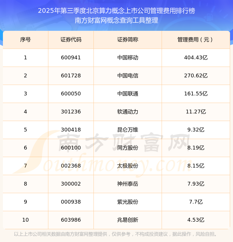 2025年第三季度,北京算力概念上市公司管理費(fèi)用排名如下:中國移動(dòng)(600941)的管理費(fèi)用總額高達(dá)404.43億,中國電信(601728)和中國聯(lián)通(600050)位居第二和第三,軟通動(dòng)力(301236)、昆侖萬維(300418)、同方股份(600100)、太極股份(002368)、神州泰岳(300002)、紫光股份(000938)、兆易創(chuàng)新(603986)分別進(jìn)入前十,其管理費(fèi)用總額分別排名第4-10名。