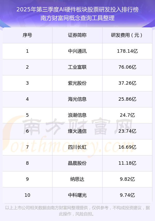 2025年第三季度AI硬件板塊股票研發(fā)投入排行榜如下:中興通訊(000063)研發(fā)投入總額高達(dá)178.14億,工業(yè)富聯(lián)(601138)和紫光股份(000938)分別排名第二和第三,海光信息(688041)、浪潮信息(000977)、烽火通信(600498)、四川長虹(600839)、晶晨股份(688099)、納思達(dá)(002180)、中科曙光(603019)分別進(jìn)入前十,其研發(fā)投入總額分別排名第4-10名。