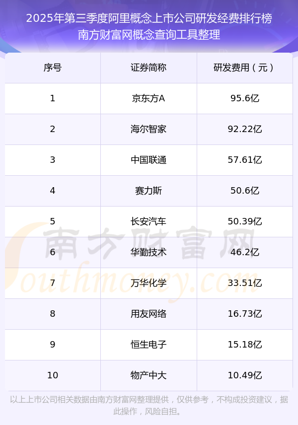 2025年第三季度,阿里概念上市公司研發(fā)經(jīng)費(fèi)排行榜中,京東方A(000725)研發(fā)經(jīng)費(fèi)總額高達(dá)95.6億,海爾智家(600690)和中國(guó)聯(lián)通(600050)排名第二和第三,賽力斯(601127)、長(zhǎng)安汽車(chē)(000625)、華勤技術(shù)(603296)、萬(wàn)華化學(xué)(600309)、用友網(wǎng)絡(luò)(600588)、恒生電子(600570)、物產(chǎn)中大(600704)進(jìn)入前十,研發(fā)經(jīng)費(fèi)總額分別排名第4-10名。