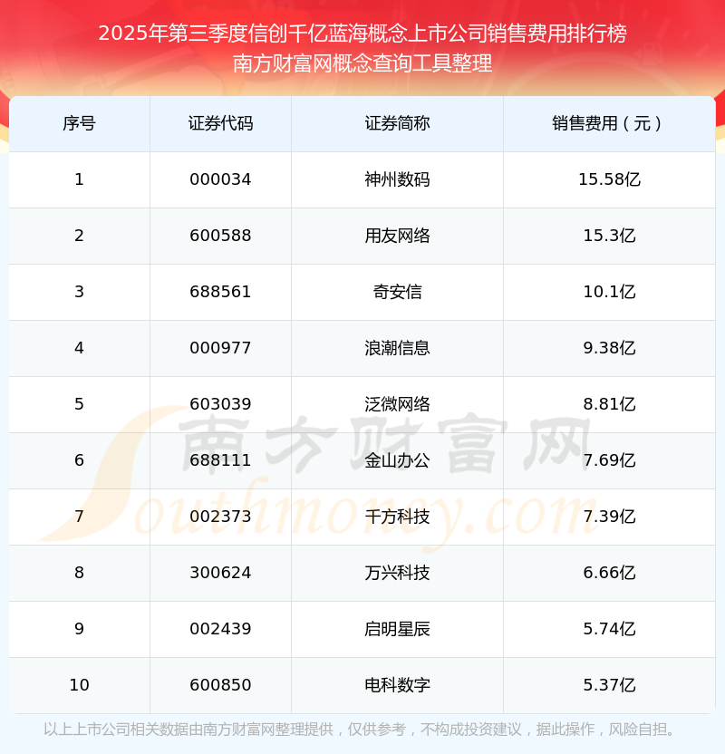2025年第三季度,信創(chuàng)千億藍(lán)海概念上市公司銷售費(fèi)用排行榜中,神州數(shù)碼(000034)銷售費(fèi)用總額高達(dá)15.58億,用友網(wǎng)絡(luò)(600588)和奇安信(688561)位居第二和第三,浪潮信息(000977)、泛微網(wǎng)絡(luò)(603039)、金山辦公(688111)、千方科技(002373)、萬興科技(300624)、啟明星辰(002439)、電科數(shù)字(600850)進(jìn)入前十,銷售費(fèi)用總額分別排名第4-10名。