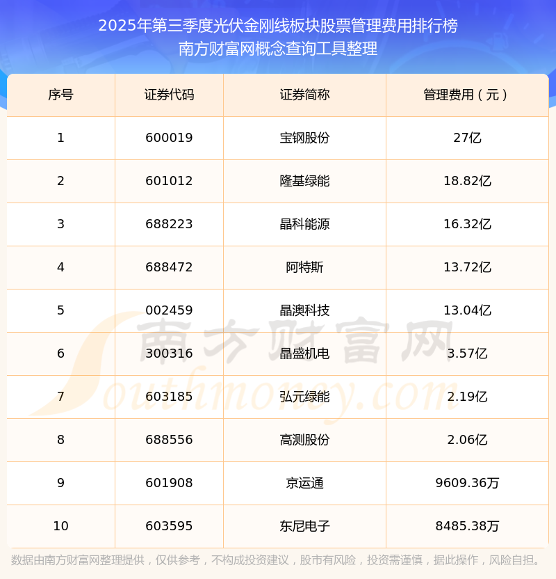2025年第三季度,光伏金剛線板塊股票管理費(fèi)用排行榜如下:寶鋼股份(600019)的管理費(fèi)用總額高達(dá)27億,隆基綠能(601012)和晶科能源(688223)分別排名第二和第三,阿特斯(688472)、晶澳科技(002459)、晶盛機(jī)電(300316)、弘元綠能(603185)、高測股份(688556)、京運(yùn)通(601908)、東尼電子(603595)分別進(jìn)入前十,其管理費(fèi)用總額分別排名第4-10名。