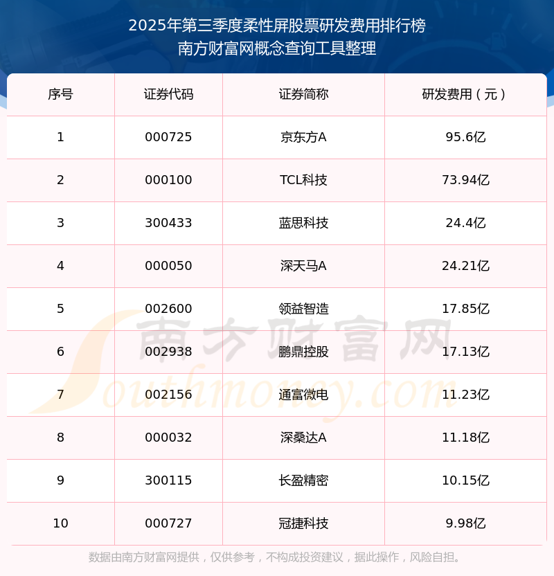 2025年第三季度,柔性屏股票研發(fā)費(fèi)用排名如下:京東方A(000725)研發(fā)費(fèi)用總額高達(dá)95.6億,TCL科技(000100)和藍(lán)思科技(300433)分別位居第二和第三,深天馬A(000050)、領(lǐng)益智造(002600)、鵬鼎控股(002938)、通富微電(002156)、深桑達(dá)A(000032)、長盈精密(300115)、冠捷科技(000727)分別進(jìn)入前十,其研發(fā)費(fèi)用總額分別排名第4-10名。