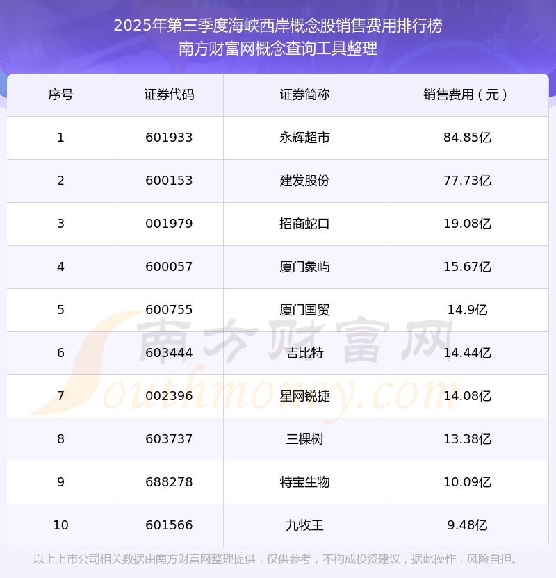 2025年第三季度,海峽西岸概念股銷售費(fèi)用排行榜如下:永輝超市(601933)的銷售費(fèi)用總額高達(dá)84.85億,建發(fā)股份(600153)和招商蛇口(001979)分別排名第二和第三,廈門象嶼(600057)、廈門國(guó)貿(mào)(600755)、吉比特(603444)、星網(wǎng)銳捷(002396)、三棵樹(603737)、特寶生物(688278)、九牧王(601566)分別進(jìn)入前十,其銷售費(fèi)用總額分別排名第4-10名。