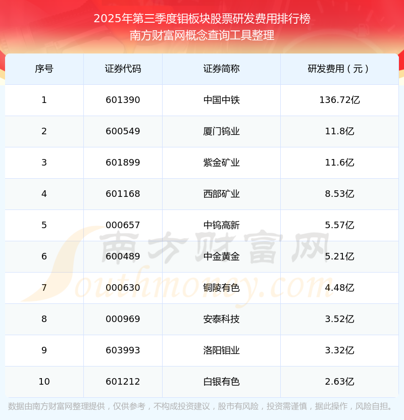 2025年第三季度,鉬板塊股票研發(fā)費用排名如下:中國中鐵(601390)研發(fā)費用總額高達136.72億,廈門鎢業(yè)(600549)和紫金礦業(yè)(601899)分別位居第二和第三,西部礦業(yè)(601168)、中鎢高新(000657)、中金黃金(600489)、銅陵有色(000630)、安泰科技(000969)、洛陽鉬業(yè)(603993)、白銀有色(601212)分別進入前十,其研發(fā)費用總額分別排名第4-10名。
