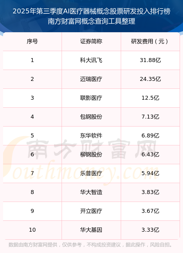 2025年第三季度AI醫(yī)療器械概念股票研發(fā)投入排行榜如下:科大訊飛(002230)研發(fā)投入總額高達(dá)31.88億,邁瑞醫(yī)療(300760)和聯(lián)影醫(yī)療(688271)分別位居第二和第三,包鋼股份(600010)、東華軟件(002065)、柳鋼股份(601003)、樂(lè)普醫(yī)療(300003)、華大智造(688114)、開(kāi)立醫(yī)療(300633)、華大基因(300676)分別進(jìn)入前十,其研發(fā)投入總額分別排名第4-10名。