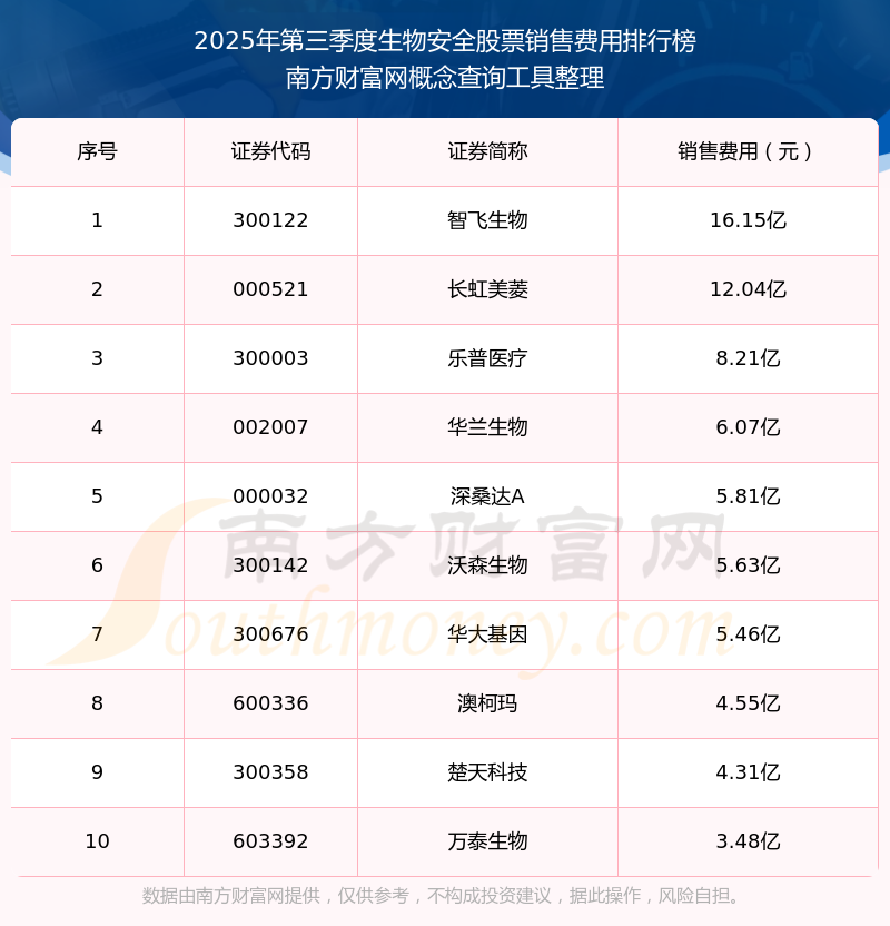 2025年第三季度,生物安全股票銷售費用排行榜中,智飛生物(300122)銷售費用總額高達16.15億,長虹美菱(000521)和樂普醫(yī)療(300003)位居第二和第三,華蘭生物(002007)、深桑達A(000032)、沃森生物(300142)、華大基因(300676)、澳柯瑪(600336)、楚天科技(300358)、萬泰生物(603392)進入前十,銷售費用總額分別排名第4-10名。
