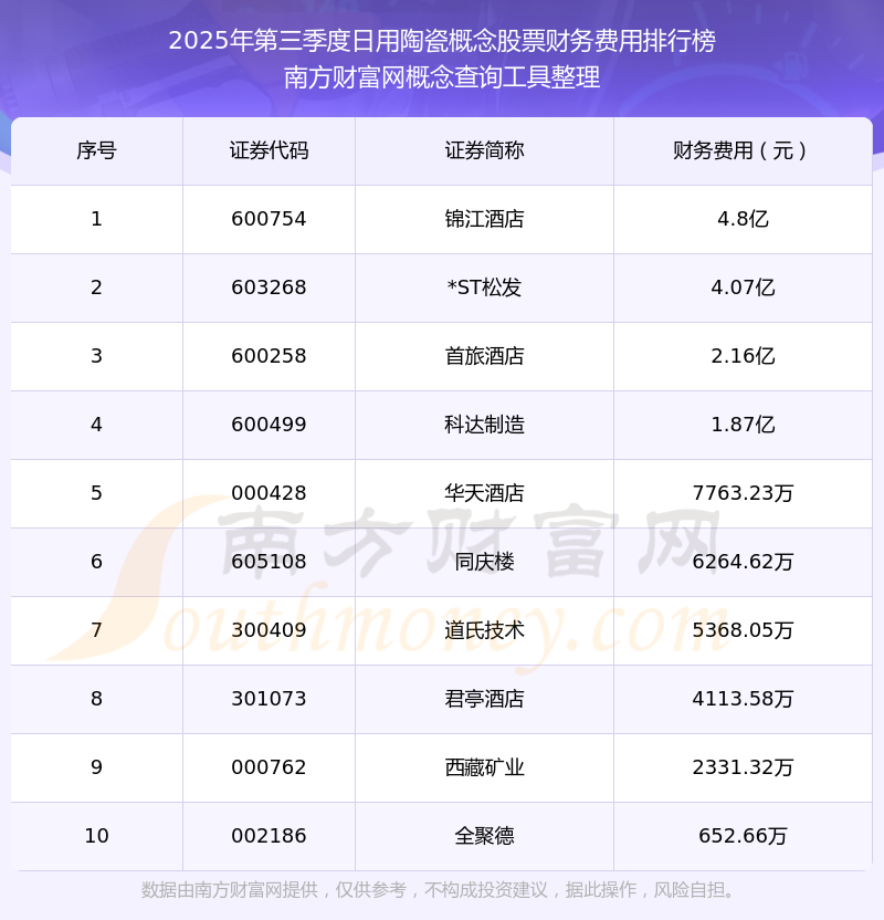 2025年第三季度日用陶瓷概念股票財(cái)務(wù)費(fèi)用排行榜如下:錦江酒店(600754)的財(cái)務(wù)費(fèi)用總額高達(dá)4.8億,*ST松發(fā)(603268)和首旅酒店(600258)分別排名第二和第三,科達(dá)制造(600499)、華天酒店(000428)、同慶樓(605108)、道氏技術(shù)(300409)、君亭酒店(301073)、西藏礦業(yè)(000762)、全聚德(002186)分別進(jìn)入前十,其財(cái)務(wù)費(fèi)用總額分別排名第4-10名。
