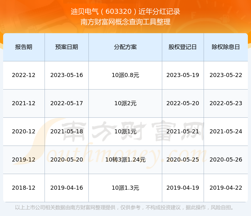 迪貝電氣最新一次公布的分紅方案:10派0.8元。