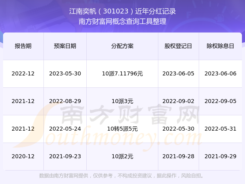 江南奕帆最新一次公布的分紅方案為10派7.11796元。本次權(quán)益分派股權(quán)登記日為2023年6月5日,除權(quán)除息日為2023年6月6日,派息日為2023年6月6日。