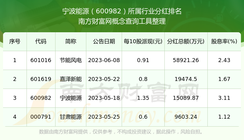 按照南方財富網(wǎng)趨勢選股系統(tǒng)統(tǒng)計,寧波能源所屬行業(yè)為電力行業(yè)行業(yè),電力行業(yè)行業(yè)分紅排名情況如下表: