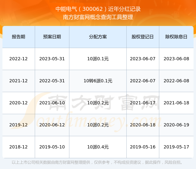 中能電氣最新一次公布的分紅方案為10派0.1元。本次權(quán)益分派股權(quán)登記日為2023年6月7日,除權(quán)除息日為2023年6月8日,派息日為2023年6月8日。