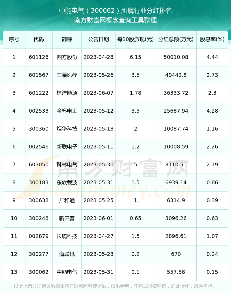 按照南方財富網(wǎng)趨勢選股系統(tǒng)統(tǒng)計,中能電氣所屬行業(yè)為輸配電行業(yè),輸配電行業(yè)分紅排名情況如下表: