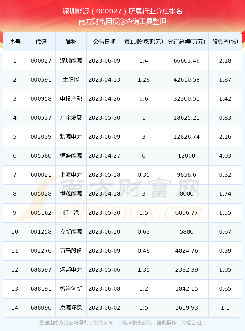 按照南方財(cái)富網(wǎng)趨勢(shì)選股系統(tǒng)統(tǒng)計(jì),深圳能源所屬行業(yè)為電力行業(yè),電力行業(yè)分紅排名情況如下表: