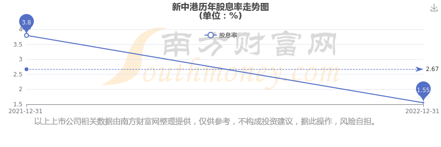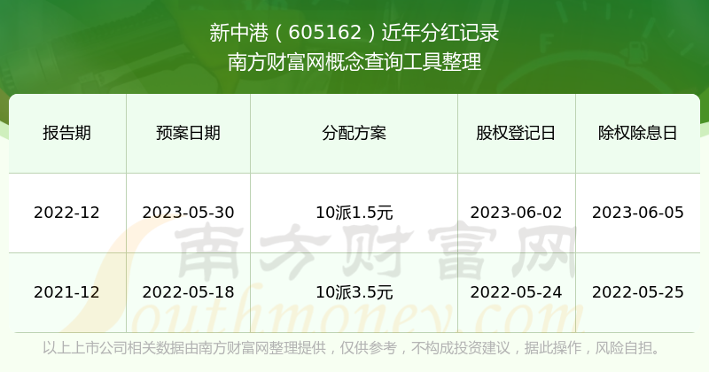 新中港最新一次公布的分紅方案為10派1.5元。本次權(quán)益分派股權(quán)登記日為2023年6月2日,除權(quán)除息日為2023年6月5日,派息日為2023年6月5日。