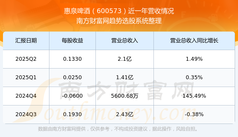 于2025年第二季度,惠泉啤酒披露了其業(yè)績表現(xiàn),其中主營業(yè)務(wù)收入2.1億元,相較于去年同期1.49%。此外,公司歸屬于母公司的凈利潤為3325.47萬元,同比增長了25.86%。在扣除所有非經(jīng)常性損益后,凈利潤3229.58萬元,同比增長48.76%。