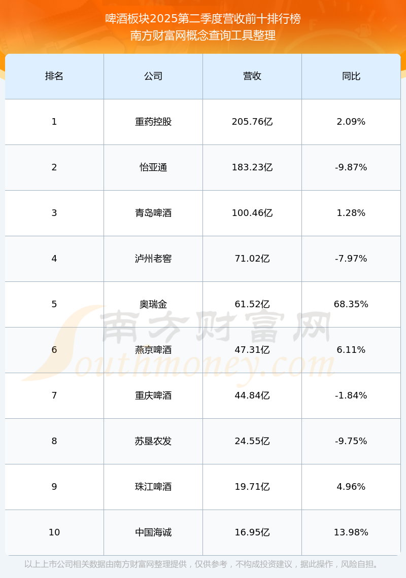 按照南方財富網(wǎng)概念查詢工具統(tǒng)計,該股所屬板塊為啤酒板塊,該板塊共有27只股票,惠泉啤酒2025第二季度營收在該板塊中排名為第22名,該板塊2025第二季度營收排名前十的股票如下表: