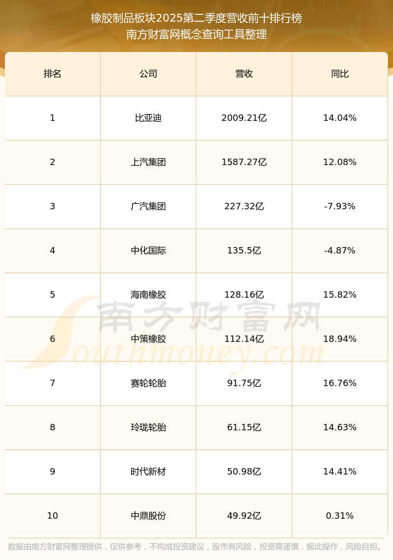 按照南方財(cái)富網(wǎng)概念查詢工具統(tǒng)計(jì),該股所屬板塊為橡膠制品板塊,該板塊共有40只股票,通用股份2025第二季度營收在該板塊中排名為第16名,該板塊2025第二季度營收排名前十的股票如下表: