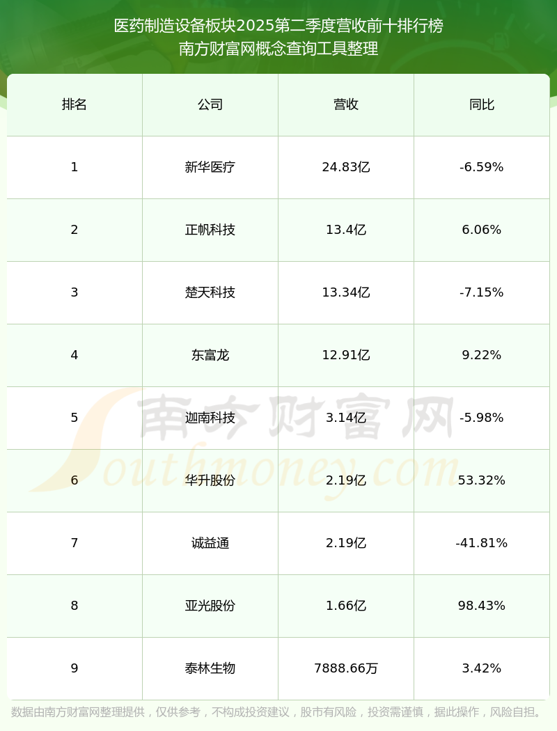 按照南方財富網(wǎng)概念查詢工具統(tǒng)計,該股所屬板塊為醫(yī)藥制造設(shè)備板塊,該板塊共有9只股票,漢邦科技2025第二季度營收在該板塊中排名為第9名,該板塊2025第二季度營收排名前十的股票如下表: