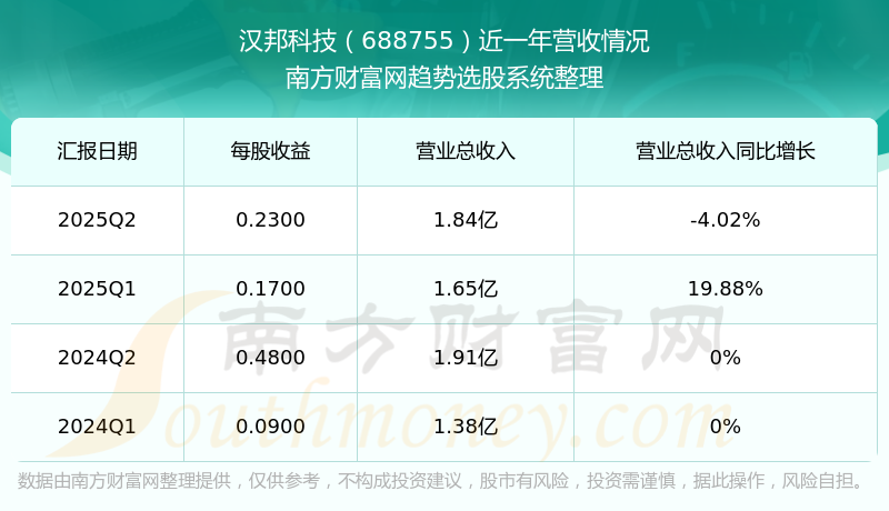 2025年第二季度,漢邦科技營收同比-4.02%,凈利潤同比-47.76%。