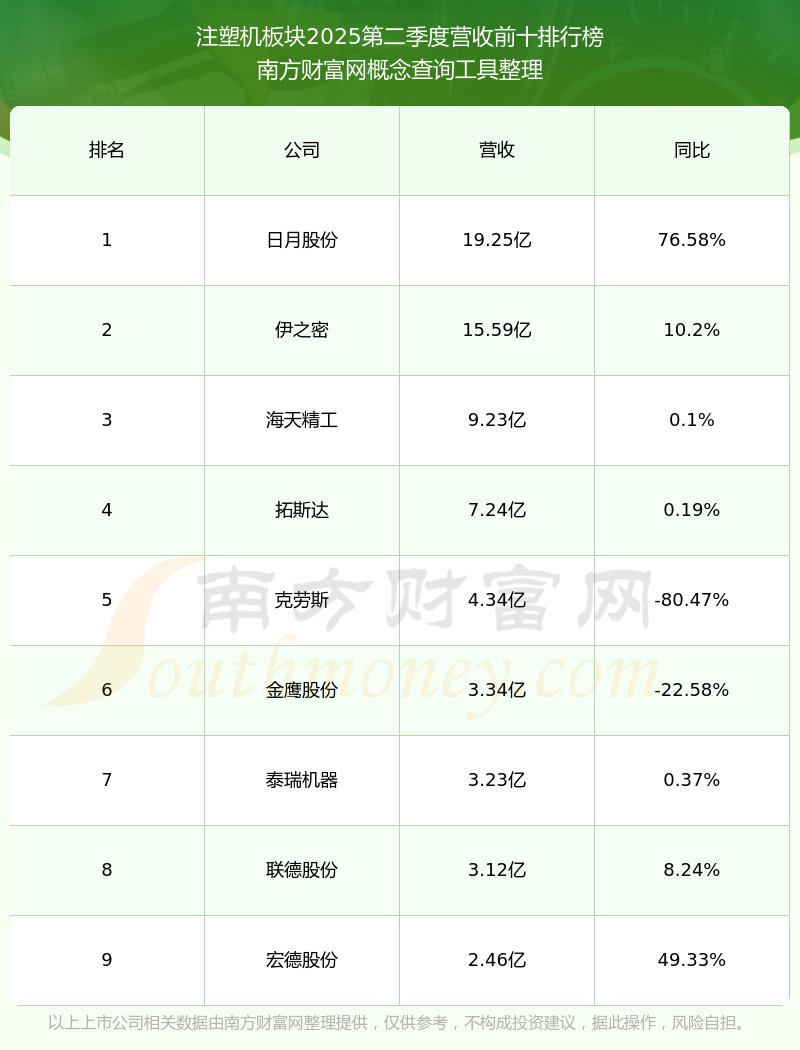 按照南方財(cái)富網(wǎng)概念查詢工具統(tǒng)計(jì),該股所屬板塊為注塑機(jī)板塊,該板塊共有9只股票,泰瑞機(jī)器2025第二季度營(yíng)收在該板塊中排名為第7名,該板塊2025第二季度營(yíng)收排名前十的股票如下表:
