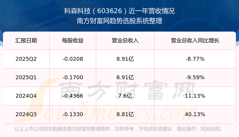 科森科技(603626)發(fā)布2025年第二季度財(cái)報(bào)。2025年第二季度科森科技實(shí)現(xiàn)營業(yè)收入8.91億元,同比增加-8.77元%,環(huán)比增加28.95%;凈利潤為-1182.9萬元,同比增長86.81%,環(huán)比增長87.33%。