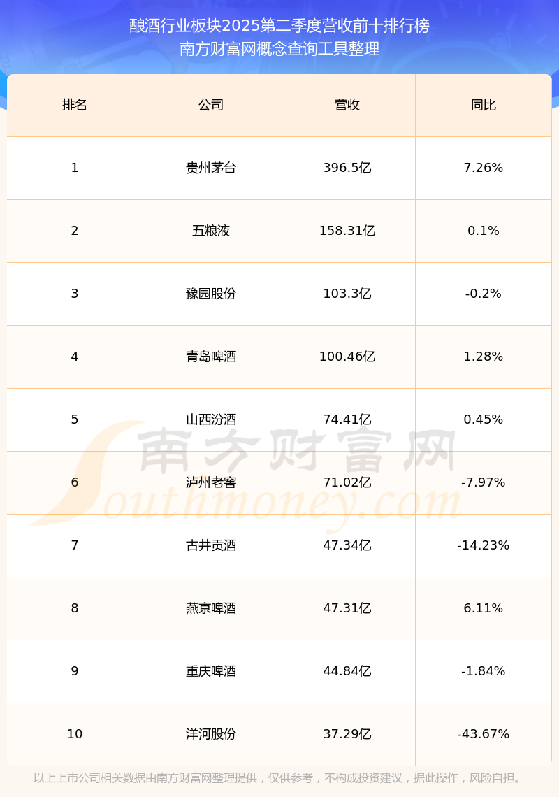 按照南方財(cái)富網(wǎng)概念查詢工具統(tǒng)計(jì),該股所屬板塊為釀酒行業(yè)板塊,該板塊共有42只股票,老白干酒2025第二季度營(yíng)收在該板塊中排名為第14名,該板塊2025第二季度營(yíng)收排名前十的股票如下表: