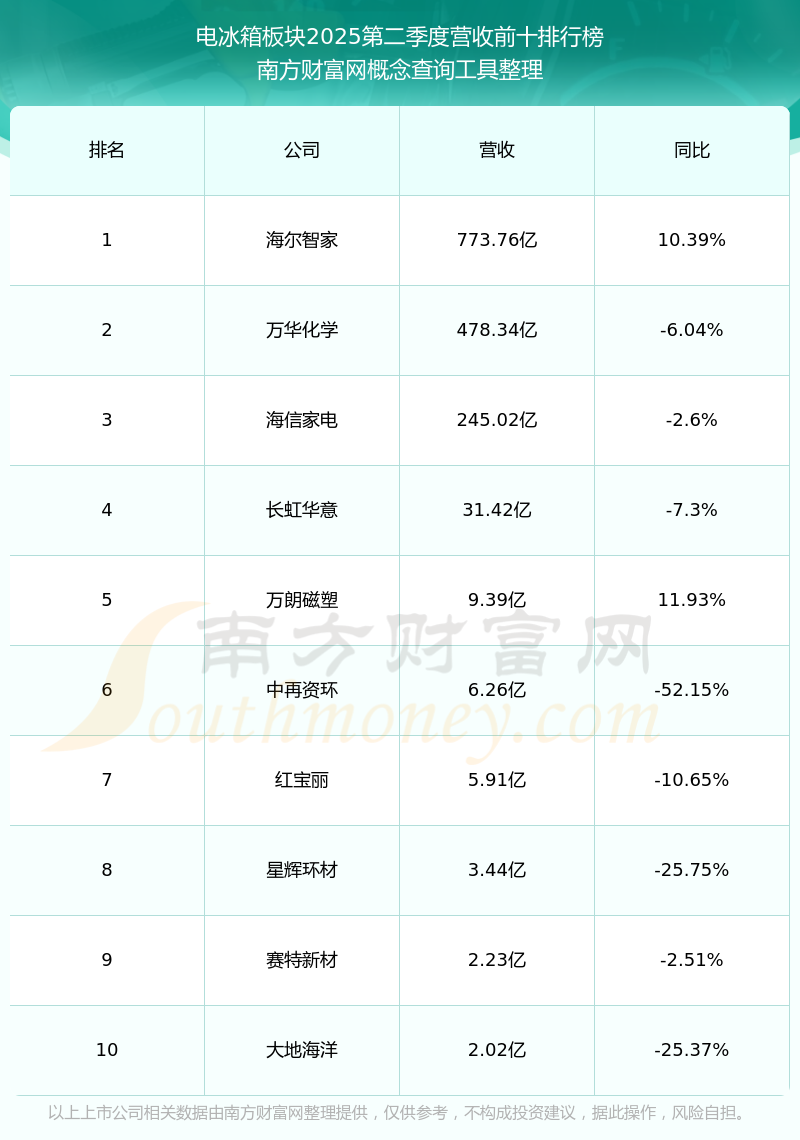 按照南方財富網(wǎng)概念查詢工具統(tǒng)計,該股所屬板塊為電冰箱板塊,該板塊共有12只股票,海爾智家2025第二季度營收在該板塊中排名為第1名,該板塊2025第二季度營收排名前十的股票如下表: