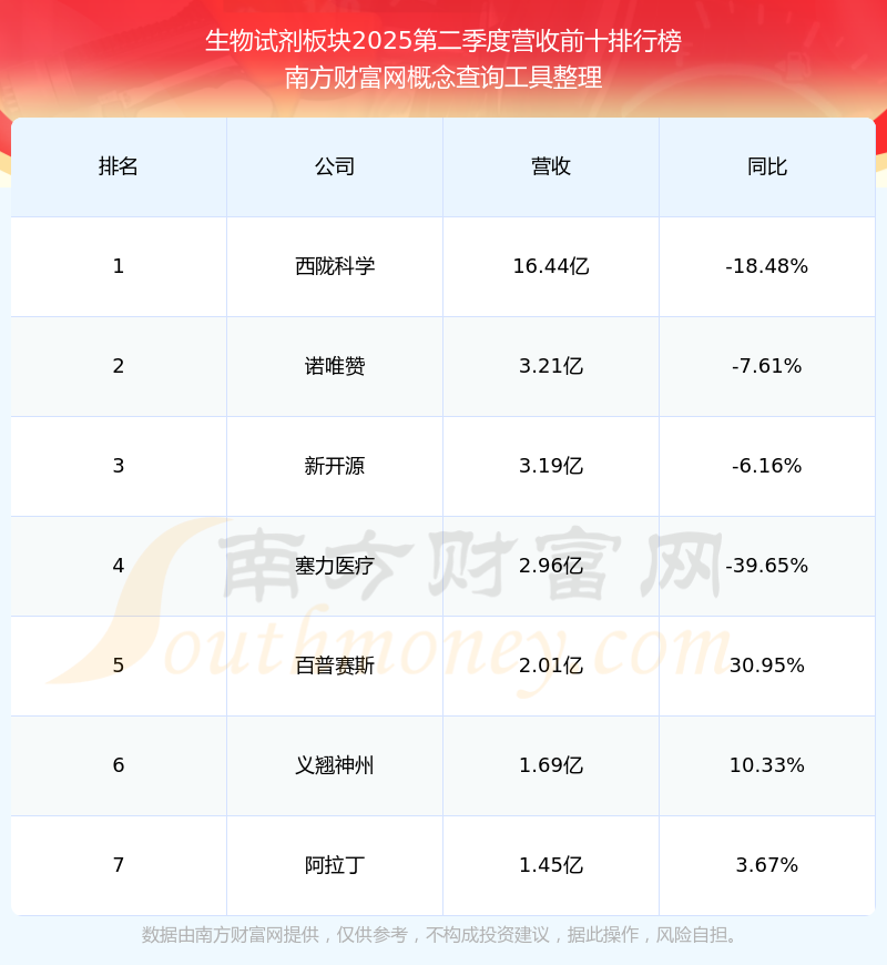 按照南方財(cái)富網(wǎng)概念查詢工具統(tǒng)計(jì),該股所屬板塊為生物試劑板塊,該板塊共有7只股票,康為世紀(jì)2025第二季度營(yíng)收在該板塊中排名為第7名,該板塊2025第二季度營(yíng)收排名前十的股票如下表: