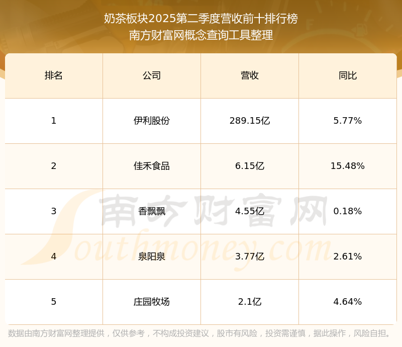 按照南方財(cái)富網(wǎng)概念查詢工具統(tǒng)計(jì),該股所屬板塊為奶茶板塊,該板塊共有5只股票,香飄飄2025第二季度營(yíng)收在該板塊中排名為第3名,該板塊2025第二季度營(yíng)收排名前十的股票如下表: