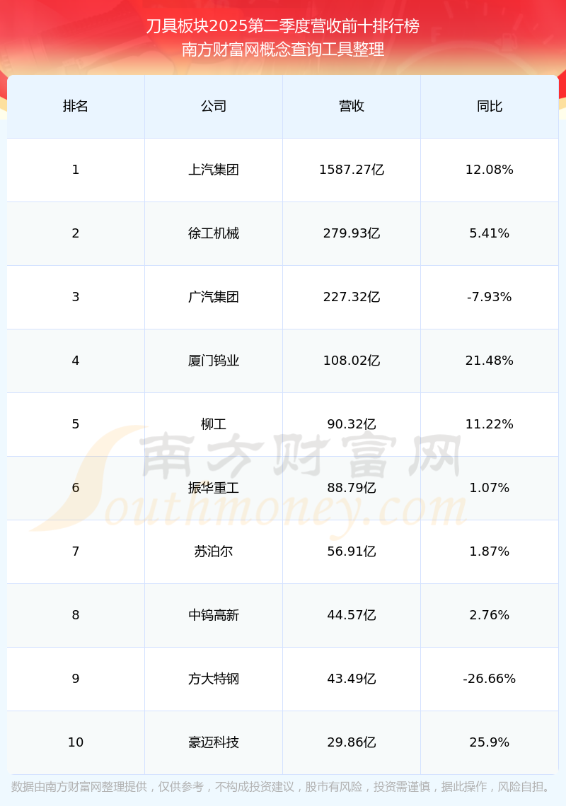 按照南方財富網(wǎng)概念查詢工具統(tǒng)計,該股所屬板塊為刀具板塊,該板塊共有32只股票,沃爾德2025第二季度營收在該板塊中排名為第27名,該板塊2025第二季度營收排名前十的股票如下表: