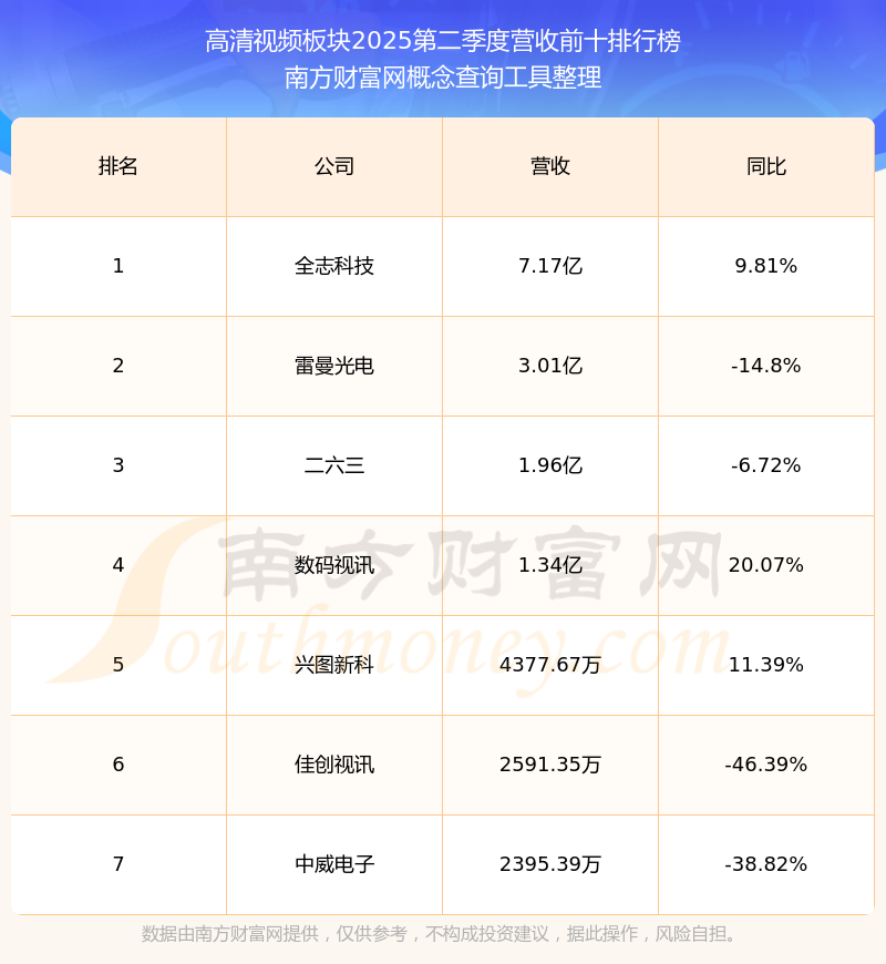 按照南方財(cái)富網(wǎng)概念查詢工具統(tǒng)計(jì),該股所屬板塊為高清視頻板塊,該板塊共有7只股票,網(wǎng)達(dá)軟件2025第二季度營收在該板塊中排名為第7名,該板塊2025第二季度營收排名前十的股票如下表: