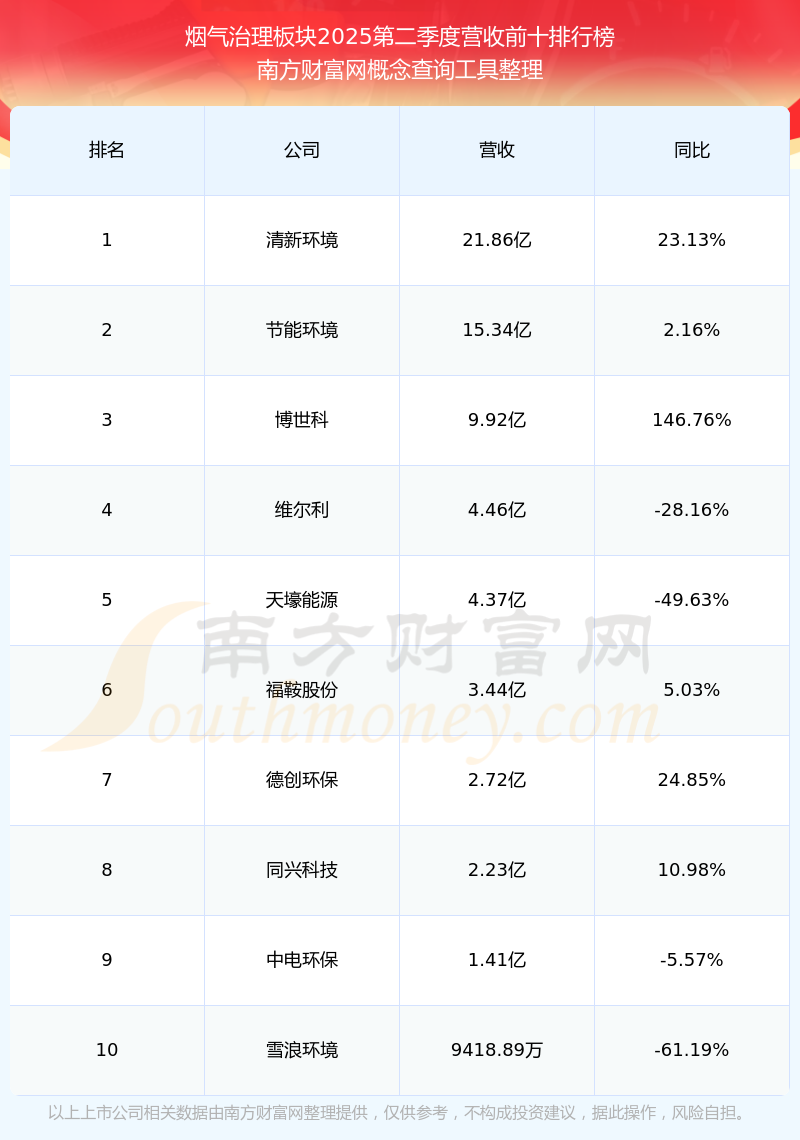 按照南方財富網(wǎng)概念查詢工具統(tǒng)計,該股所屬板塊為煙氣治理板塊,該板塊共有11只股票,德創(chuàng)環(huán)保2025第二季度營收在該板塊中排名為第7名,該板塊2025第二季度營收排名前十的股票如下表: