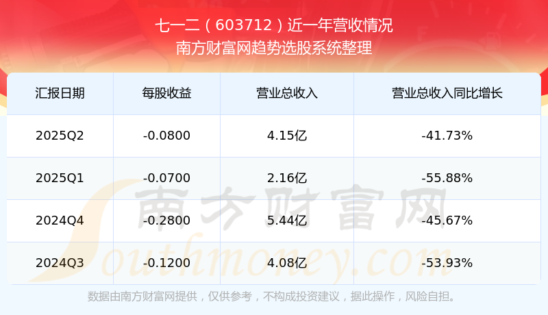 于2025年第二季度,七一二披露了其業(yè)績表現(xiàn),其中主營業(yè)務(wù)收入4.15億元,相較于去年同期-41.73%。此外,公司歸屬于母公司的凈利潤為-6021.8萬元,同比增長了-217.94%。在扣除所有非經(jīng)常性損益后,凈利潤-7080.2萬元,同比增長-254.17%。