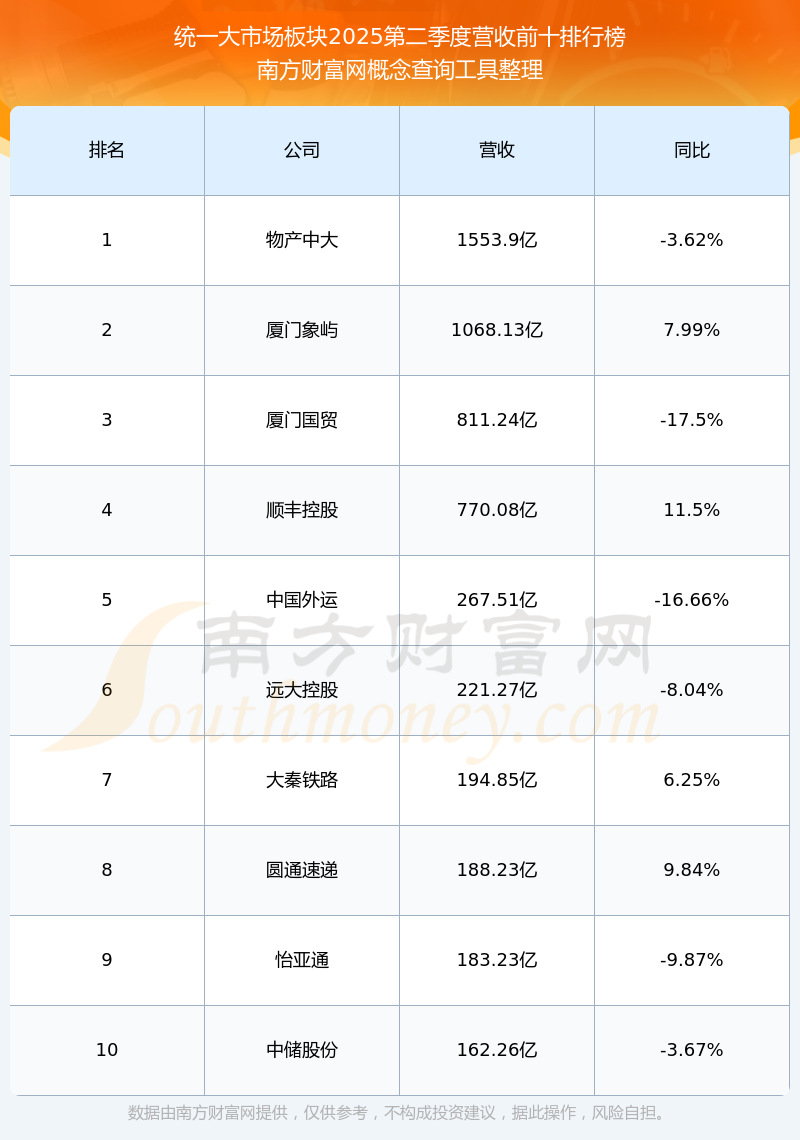 按照南方財(cái)富網(wǎng)概念查詢工具統(tǒng)計(jì),該股所屬板塊為統(tǒng)一大市場(chǎng)板塊,該板塊共有110只股票,外服控股2025第二季度營(yíng)收在該板塊中排名為第110名,該板塊2025第二季度營(yíng)收排名前十的股票如下表: