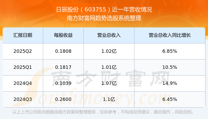 日辰股份2025年第二季度報(bào)告顯示,公司實(shí)現(xiàn)主營(yíng)業(yè)務(wù)收入1.02億元,較去年同期增長(zhǎng)6.85%;歸屬于母公司股東的凈利潤(rùn)為1757.28萬(wàn)元,同比增長(zhǎng)11.04%;扣除非經(jīng)常性損益后的凈利潤(rùn)為1746.23萬(wàn)元,同比增長(zhǎng)14.15%。