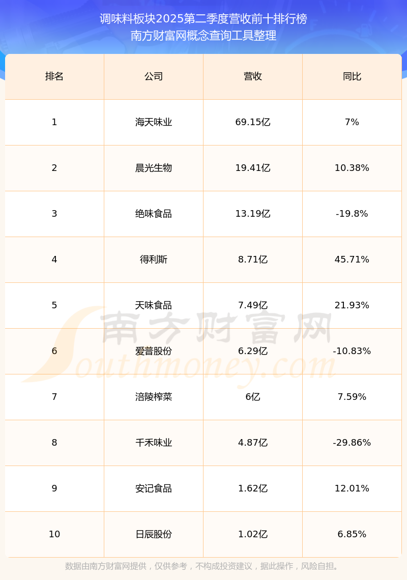 按照南方財(cái)富網(wǎng)概念查詢工具統(tǒng)計(jì),該股所屬板塊為調(diào)味料板塊,該板塊共有11只股票,日辰股份2025第二季度營(yíng)收在該板塊中排名為第10名,該板塊2025第二季度營(yíng)收排名前十的股票如下表: