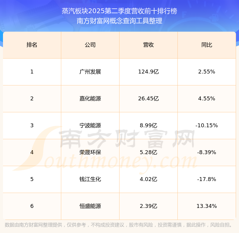按照南方財(cái)富網(wǎng)概念查詢工具統(tǒng)計(jì),該股所屬板塊為蒸汽板塊,該板塊共有6只股票,亨通股份2025第二季度營(yíng)收在該板塊中排名為第6名,該板塊2025第二季度營(yíng)收排名前十的股票如下表: