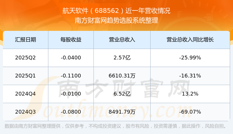 航天軟件(688562)披露2025年第二季度報告,報告期實現(xiàn)營收2.57億元,同比-25.99%;歸母凈利潤-1726.06萬元,同比41.52%;扣非凈利潤-4003.45萬元,同比-23.09%;基本每股收益-0.04元。