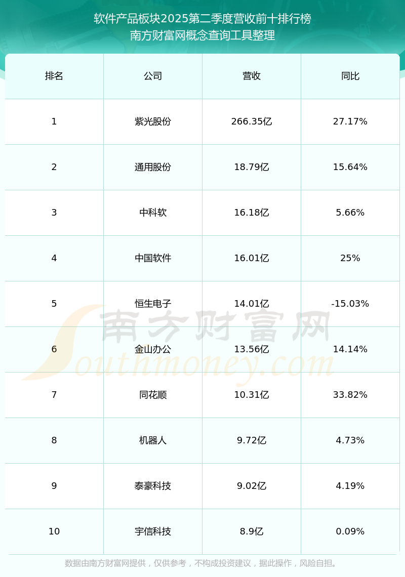 按照南方財富網(wǎng)概念查詢工具統(tǒng)計,該股所屬板塊為軟件產(chǎn)品板塊,該板塊共有28只股票,航天軟件2025第二季度營收在該板塊中排名為第28名,該板塊2025第二季度營收排名前十的股票如下表: