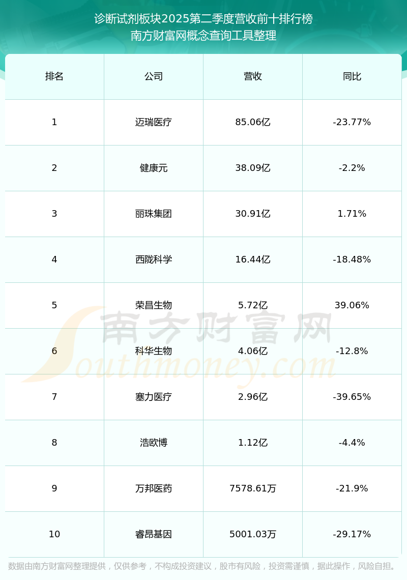 按照南方財(cái)富網(wǎng)概念查詢工具統(tǒng)計(jì),該股所屬板塊為診斷試劑板塊,該板塊共有11只股票,諾唯贊2025第二季度營收在該板塊中排名為第11名,該板塊2025第二季度營收排名前十的股票如下表: