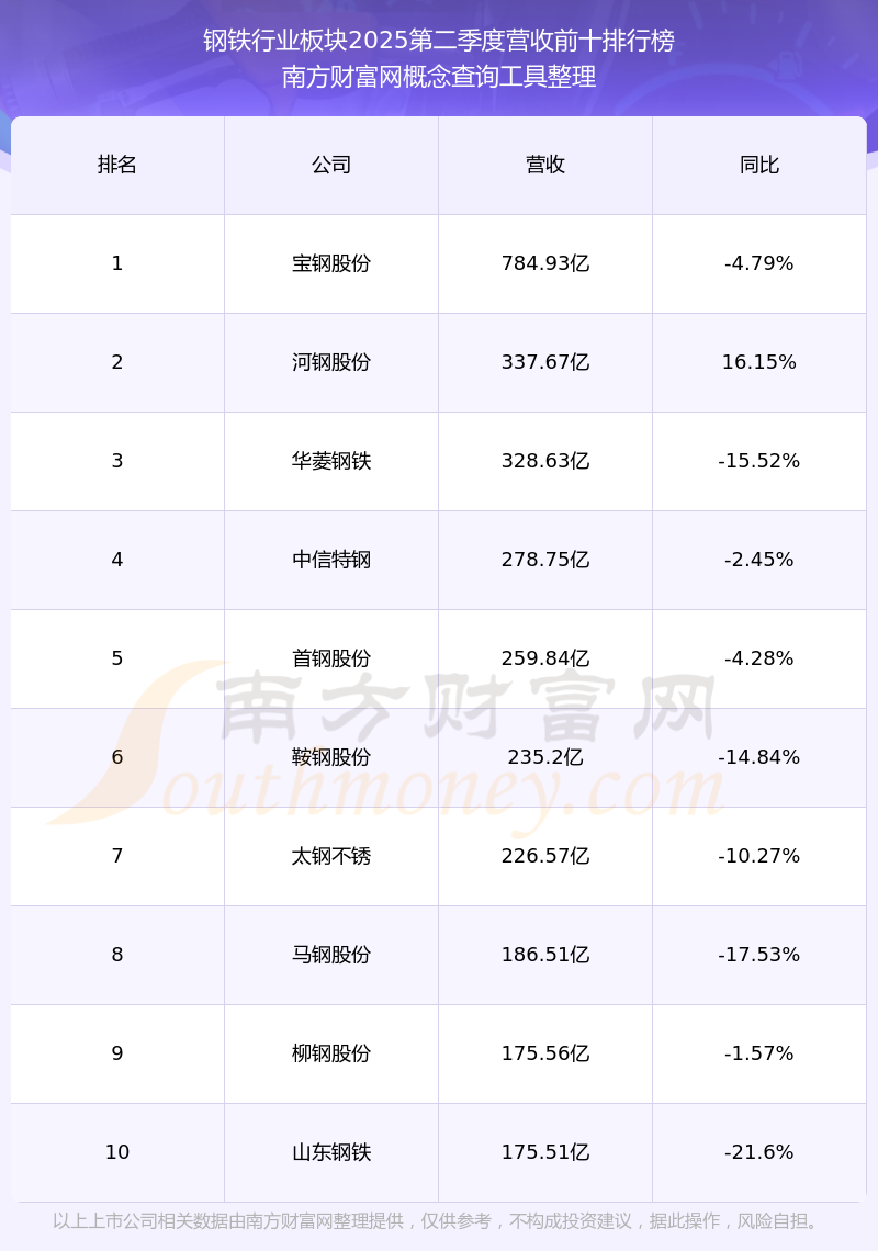 按照南方財(cái)富網(wǎng)概念查詢工具統(tǒng)計(jì),該股所屬板塊為鋼鐵行業(yè)板塊,該板塊共有41只股票,方大特鋼2025第二季度營收在該板塊中排名為第24名,該板塊2025第二季度營收排名前十的股票如下表: