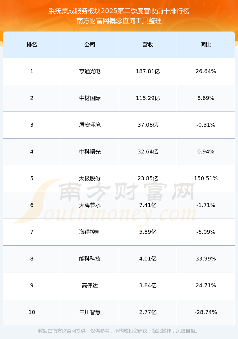 按照南方財富網(wǎng)概念查詢工具統(tǒng)計,該股所屬板塊為系統(tǒng)集成服務(wù)板塊,該板塊共有12只股票,和達(dá)科技2025第二季度營收在該板塊中排名為第12名,該板塊2025第二季度營收排名前十的股票如下表: