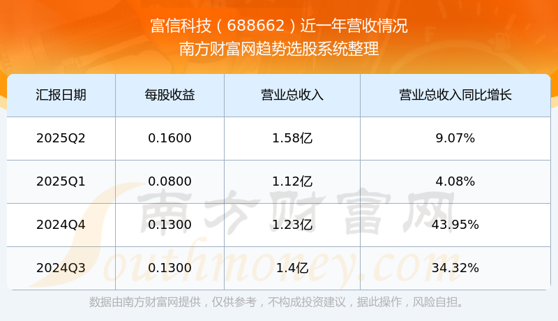 富信科技2025年第二季度公司實現(xiàn)營業(yè)收入1.58億元,同比9.07%;歸母凈利潤1331.69萬元,同比-2.57%。