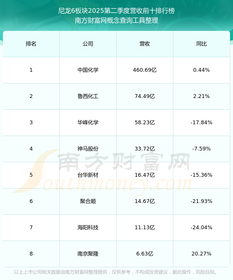 按照南方財富網(wǎng)概念查詢工具統(tǒng)計,該股所屬板塊為尼龍6板塊,該板塊共有8只股票,海陽科技2025第二季度營收在該板塊中排名為第7名,該板塊2025第二季度營收排名前十的股票如下表: