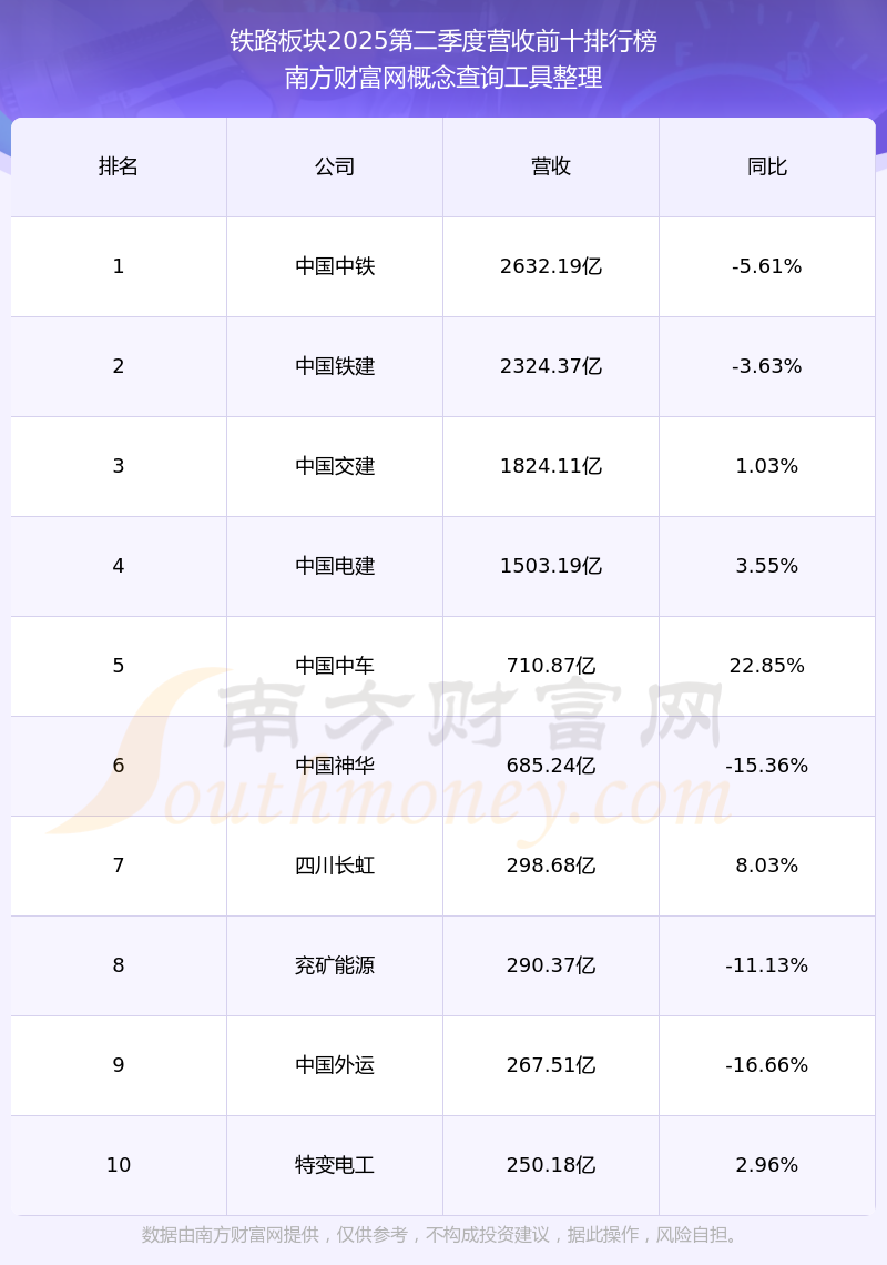按照南方財(cái)富網(wǎng)概念查詢(xún)工具統(tǒng)計(jì),該股所屬板塊為鐵路板塊,該板塊共有138只股票,中國(guó)通號(hào)2025第二季度營(yíng)收在該板塊中排名為第24名,該板塊2025第二季度營(yíng)收排名前十的股票如下表: