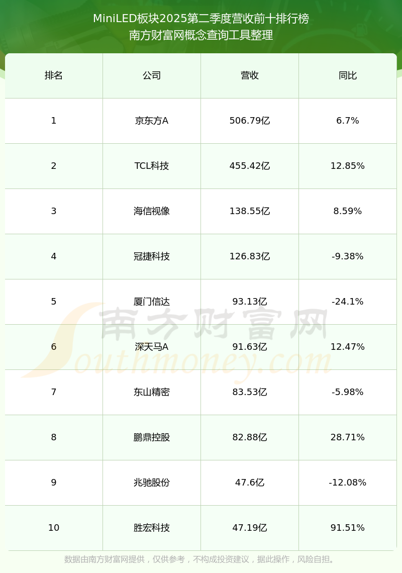 按照南方財富網(wǎng)概念查詢工具統(tǒng)計,該股所屬板塊為MiniLED板塊,該板塊共有77只股票,博敏電子2025第二季度營收在該板塊中排名為第36名,該板塊2025第二季度營收排名前十的股票如下表: