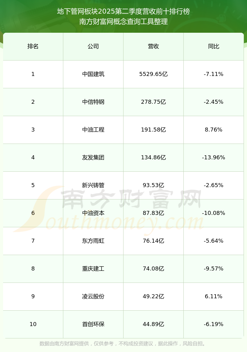 按照南方財富網(wǎng)概念查詢工具統(tǒng)計,該股所屬板塊為地下管網(wǎng)板塊,該板塊共有66只股票,郴電國際2025第二季度營收在該板塊中排名為第22名,該板塊2025第二季度營收排名前十的股票如下表: