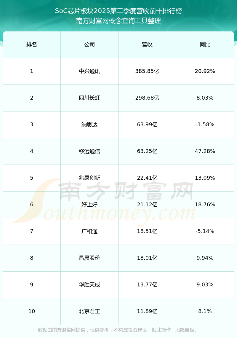 按照南方財(cái)富網(wǎng)概念查詢工具統(tǒng)計(jì),該股所屬板塊為SoC芯片板塊,該板塊共有52只股票,晶華微2025第二季度營(yíng)收在該板塊中排名為第52名,該板塊2025第二季度營(yíng)收排名前十的股票如下表: