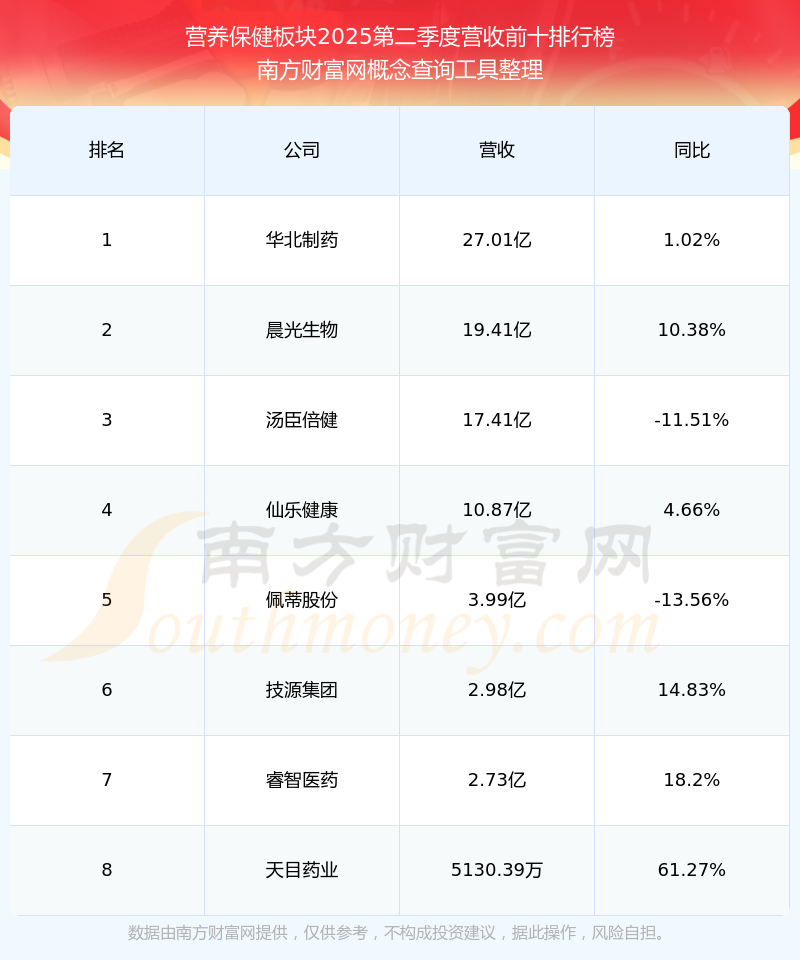 按照南方財富網(wǎng)概念查詢工具統(tǒng)計,該股所屬板塊為營養(yǎng)保健板塊,該板塊共有8只股票,技源集團2025第二季度營收在該板塊中排名為第6名,該板塊2025第二季度營收排名前十的股票如下表: