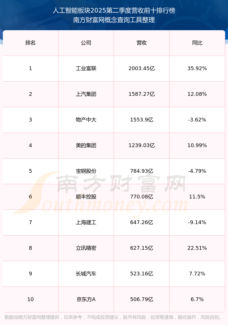 按照南方財富網(wǎng)概念查詢工具統(tǒng)計,該股所屬板塊為人工智能板塊,該板塊共有966只股票,佳都科技2025第二季度營收在該板塊中排名為第124名,該板塊2025第二季度營收排名前十的股票如下表: